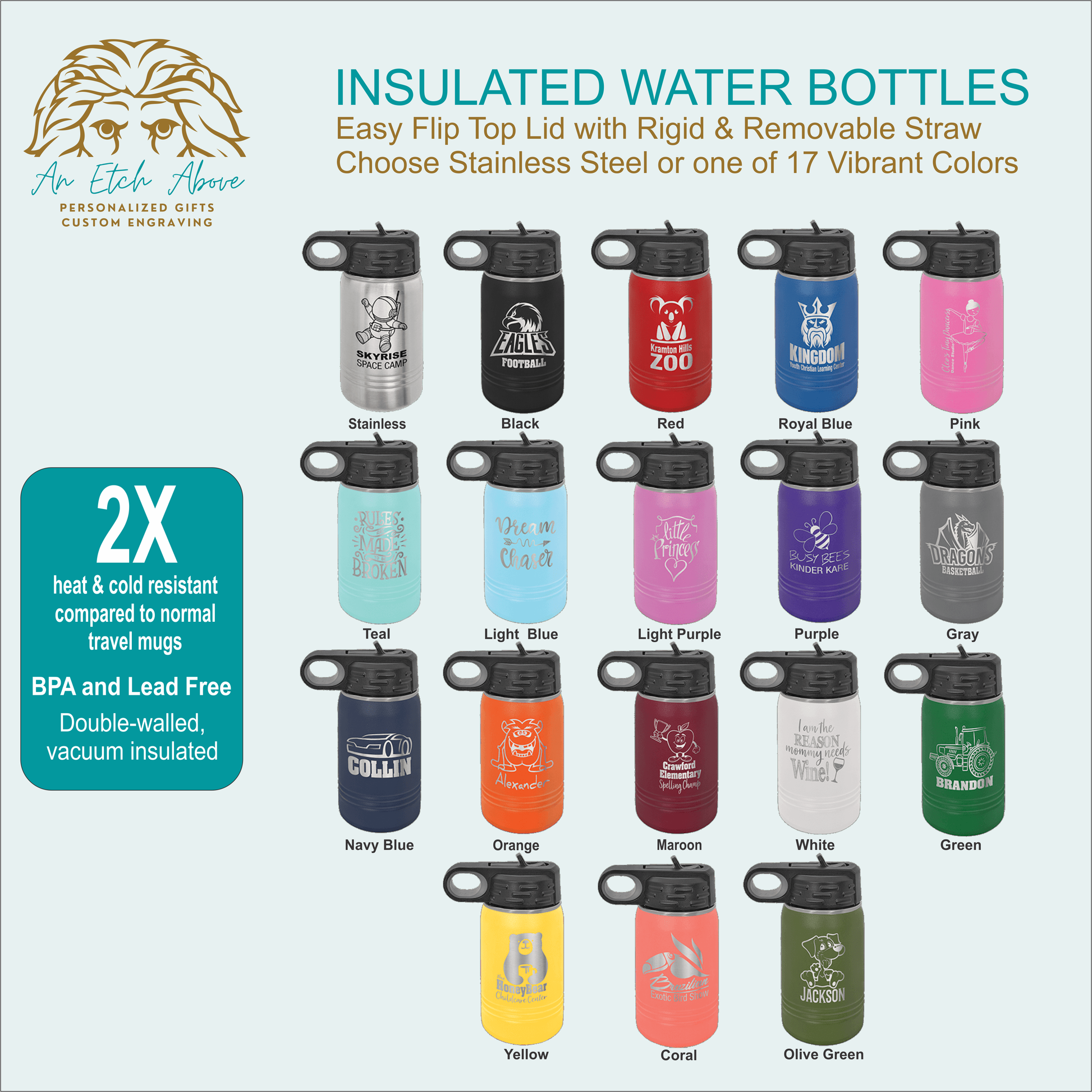 Kid's Sized 12 oz. Water Bottle with built in straw -18 colors available