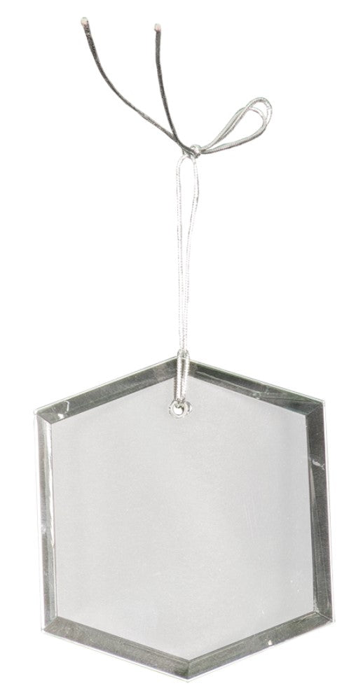 Hexagon shaped with beveled edges, measures 3" high by 2.75" wide, includes silver ribbon and gift box