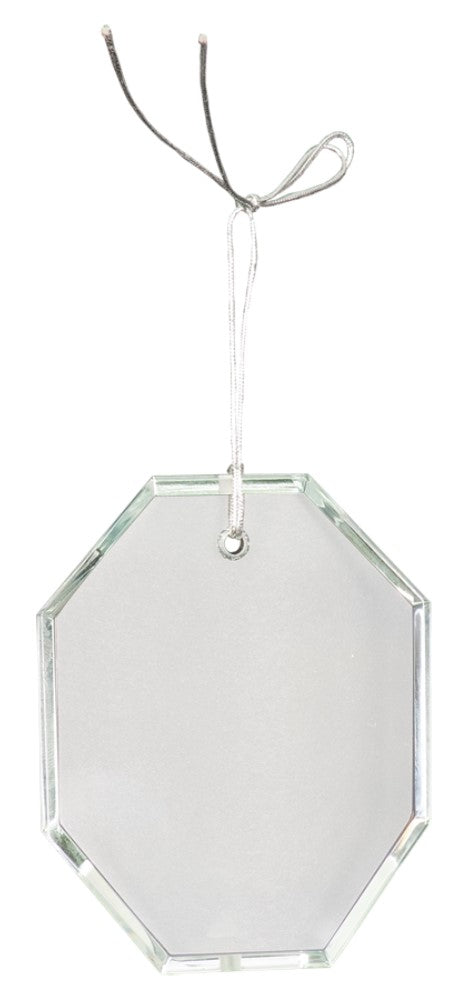 Octagon shaped with beveled edges, measures 3.5" high by 2.6875" wide, includes silver ribbon and gift box