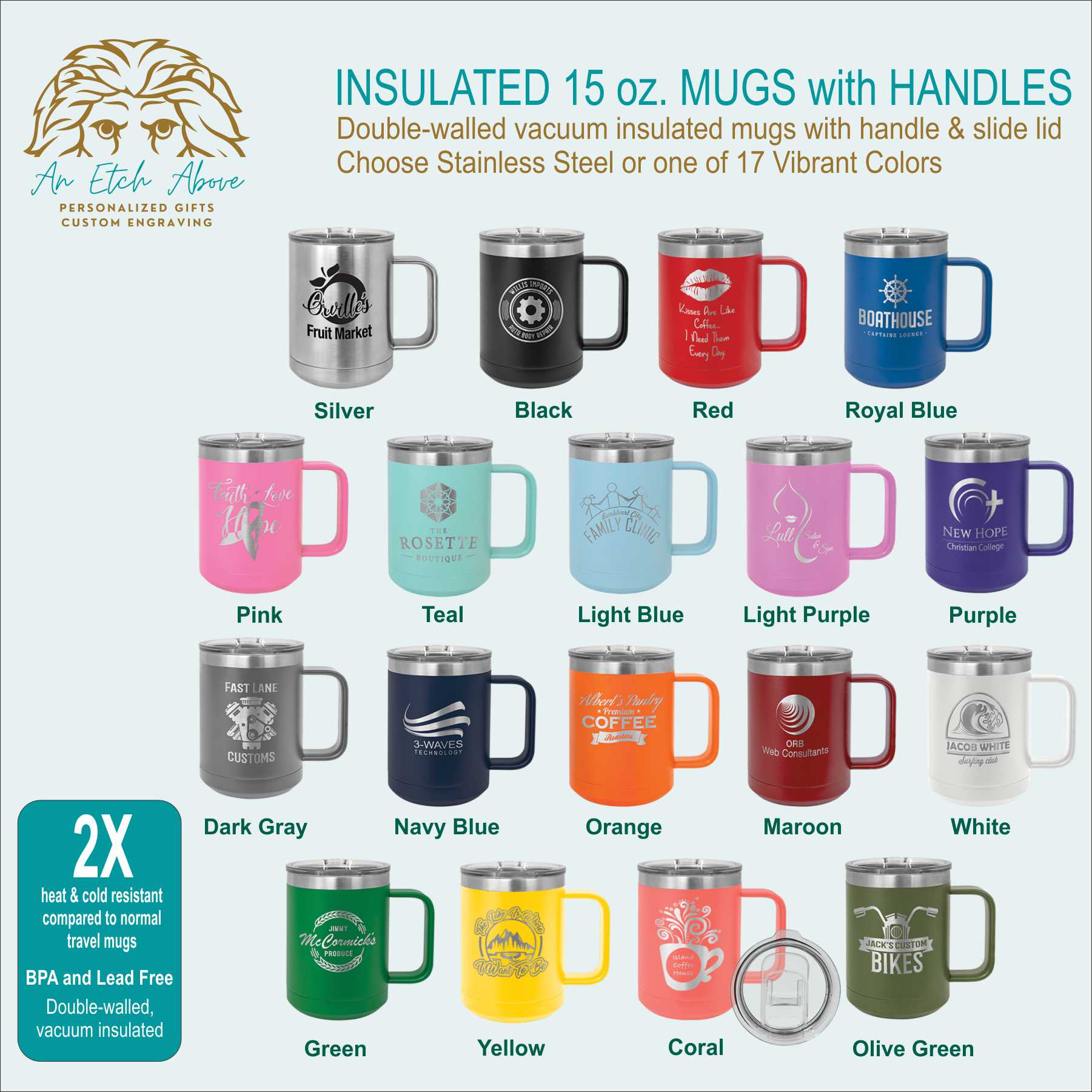 Insulated 15 oz Mug includes Slide Lid - 18 colors available